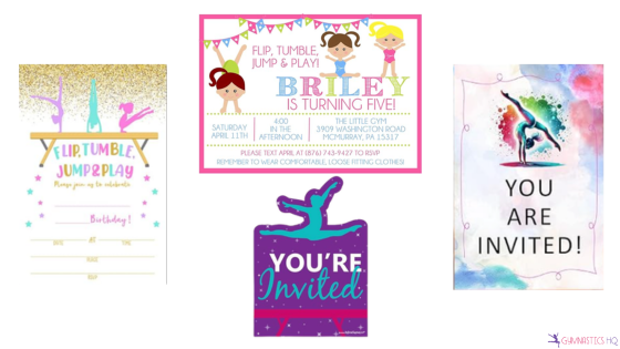 Regardless of whether you have the party at a gym or at your house, you will need gymnastics birthday invitations! However, check with the gymnastics center first to see if they give you free invitations to mail to your party guests. Often times gyms have invitations that include a waiver form so that parents can fill it out and bring it on the day of the party. If you have a party at the gym but opt for your own invites then consider getting the gym’s invitations too so you can include the waiver portion with your invite. This makes things easier for your guests and the gym staff, assuming your guests fill out the form and bring it along to the party.